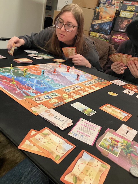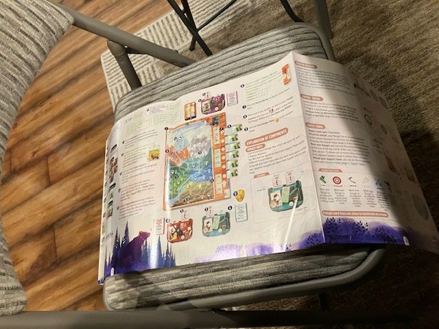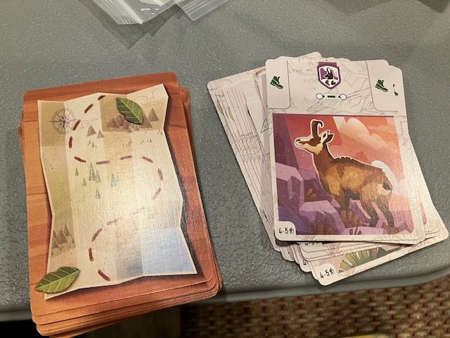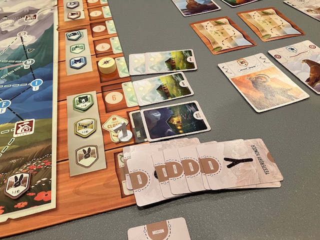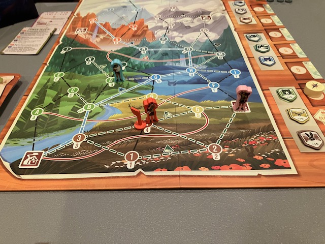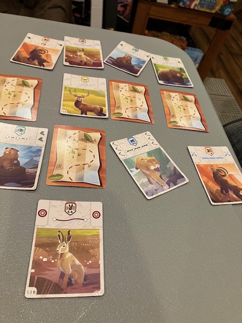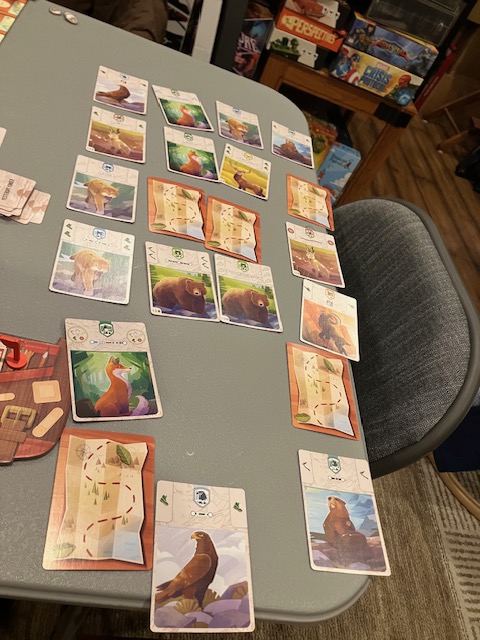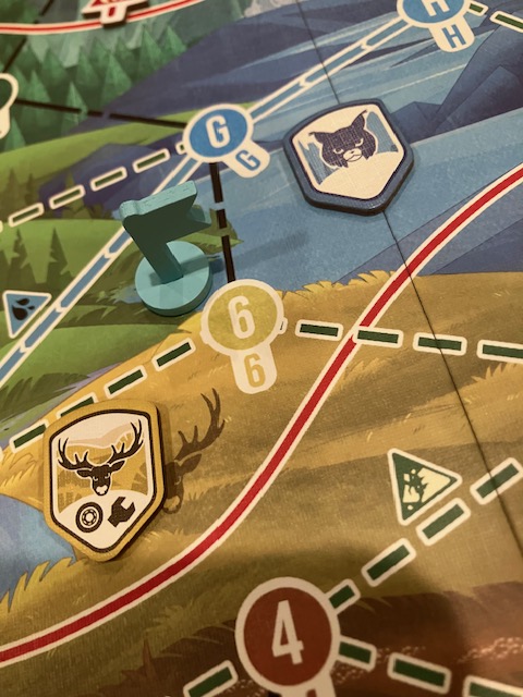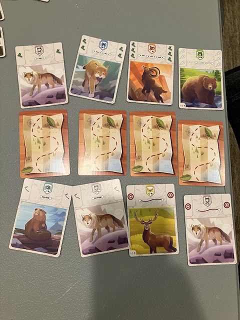 This is a game about players working together to traverse a map and find animals! The first few games, we joked, were like Pokemon! Find them all! You are traveling around a map to complete missions and, along the way, record seeing some animals! A very fun theme!