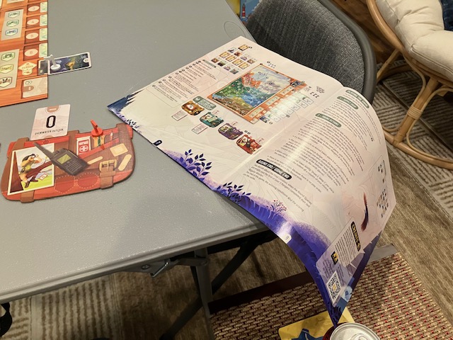 First of all, these rulebooks completely fail the Chair Test! Each rulebook is some sort of weird multi-fold rulebook that is impossible pull apart. It’s not a rulebook with staples; it’s 4 pages in a weird quad-fold. This is SO HARD to access! I can’t really set it on the chair next to me, it totally droops! The font is pretty small, so that doesn’t help. It does have a lot of pictures, but that doesn’t save it. This rulebook is almost unusable. I can’t emphasize enough how horrible this form factor is.