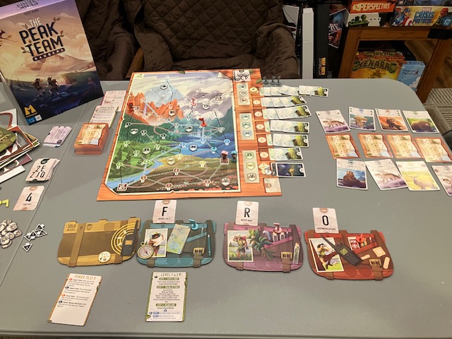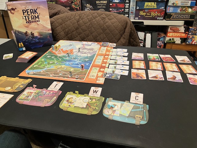 The Peak Team is a cooperative game for 1-5 players. This feels like a pick-up and deliver game, as you traverse a map trying to reach flags; strictly speaking, BGG doesn’t classify this as a pick-up and deliver (see here) but more hand management and pattern movement.