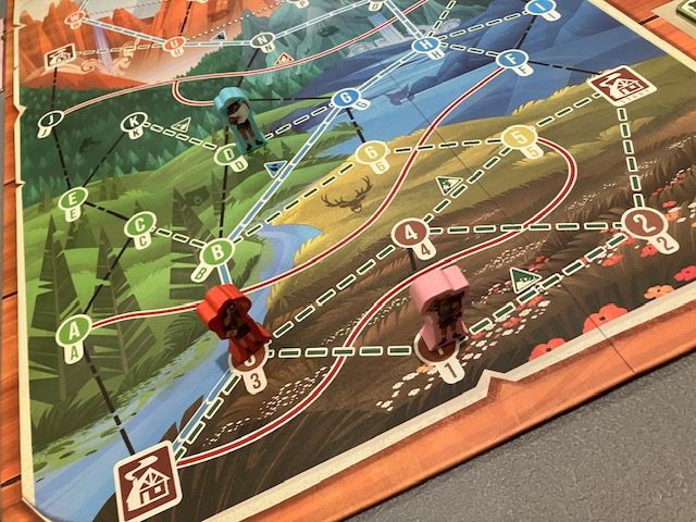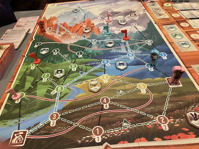 You can see a game in mid play (above) as the flags notate where each ranger needs to go! And you can also see the paths: each one different. The colors of the Locations indicate which animals are in the area; if you have an animal card of the right color for your spot, you can discard it and see it!
