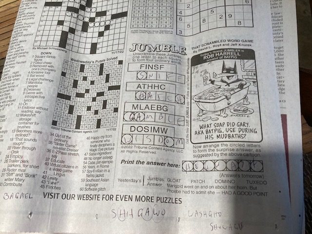 If I can’t get the puzzle in my head, I have to write letters down and rearrange them to get the answer November 20, 2022November 23, 2022 640 × 480 IMG_4128