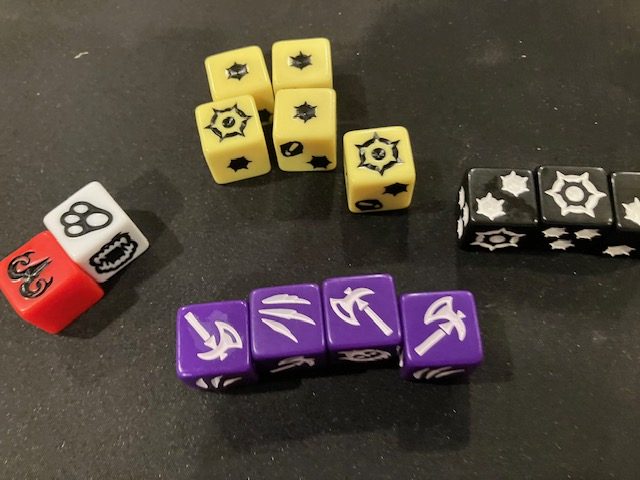 Axis 1: The Search Dice. These must be rolled whenever Frodo travels (if he can’t sneak), or if a Shadows card forces a Search roll. The number of dice depend on the number of Nazguls in your region. See above for all 6 faces. If you roll an “evil tree” (see above), you lose Hope. Remember, if your Hope goes to 0, you lose. You can re-roll some dice, at the cost of some resources. They are re-rolls, not guarantees.