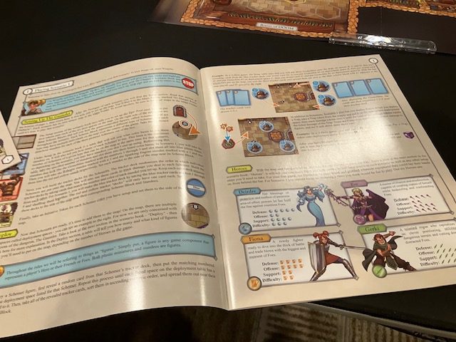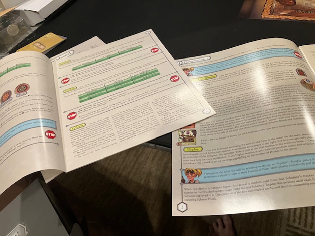 The rulebook opens up and stays open on the chair next to me. The font is big, the pictures are well-annotated, and it’s easy to read on the chair next to me!