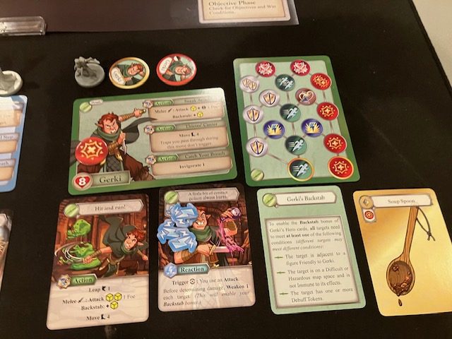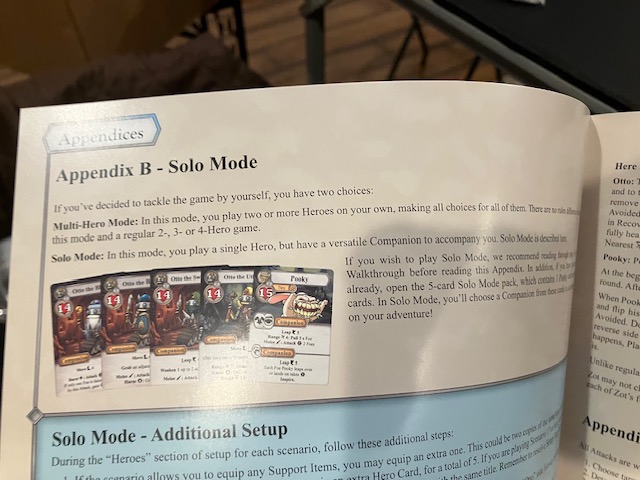 The solo rules are well documented on page 22. See above! (And thank you for following Saunders’ Law!) These rules are generally very good and very clear. One problem I had: it’s not quite clear if you can share the tokens between all 5 characters, … but you can sort of infer that you can (because when a single players plays two characters, they can share tokens); it should have been stated more explicitly. EDIT: Yes, the rule is there! I missed it, and I could have sworn I looked like 3 times. My mistake!!!
